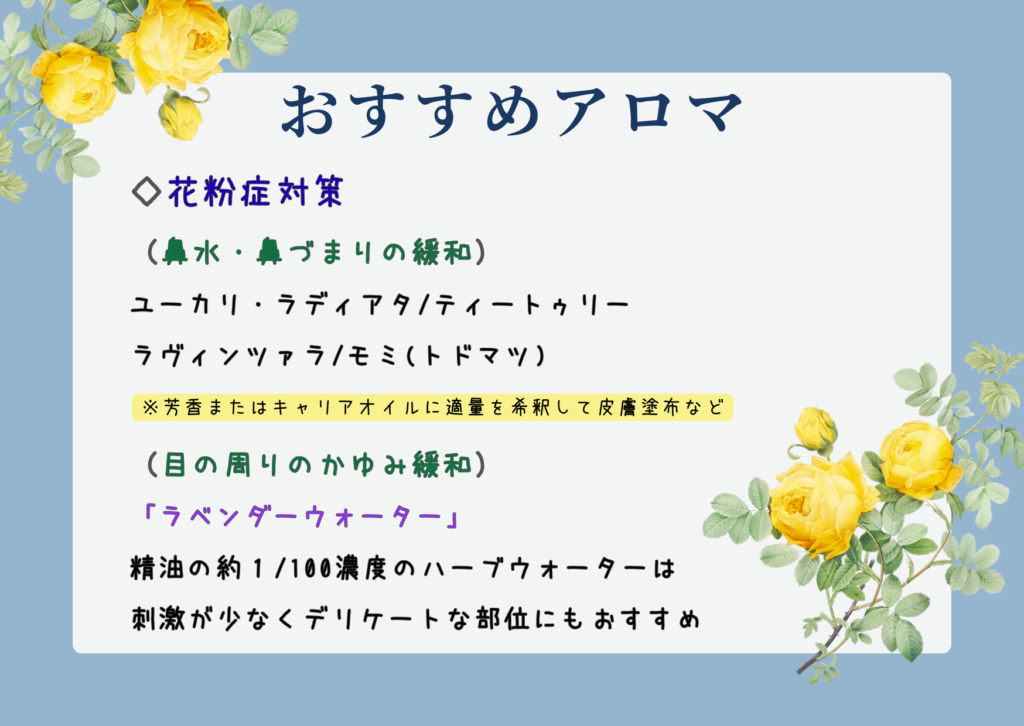 好きだと感じるやさしい香りを、休む前の合図にしてみるのもひとつです。香りそのもので花粉症を治すわけではありませんが、気持ちが落ち着くきっかけになることがあります。つらい季節ほど、「ほっとする感覚」を作っておくことが大切です。